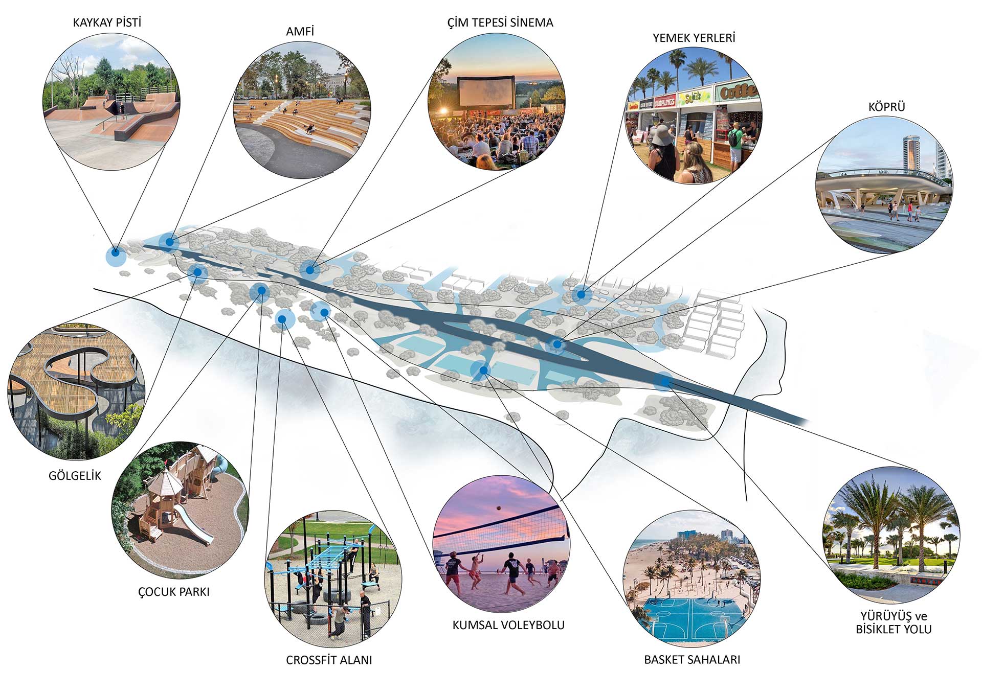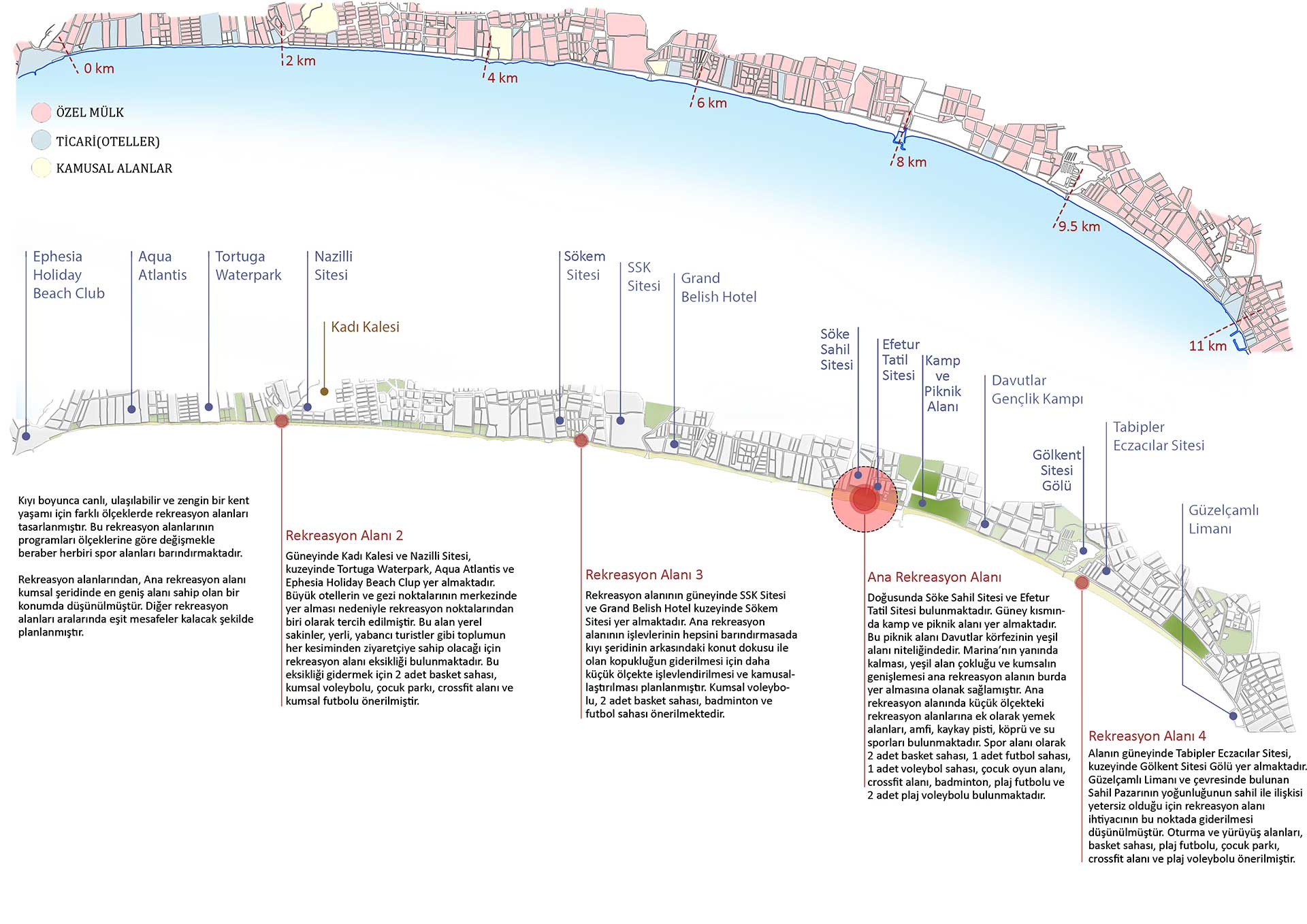 Davutlar Körfezi, Ephesia Holiday Beach Club’ün kuzeyinden başlayıp Güzelçamlı Sahil Pazarı’nın güneyine kadar devam eden 11 km’lik bir alanda yer almaktadır. Sahil boyunca kumsal genişliği zaman zaman daralıp genişlemektedir. Ana rekreasyon alanı seçilirken kumsalın Marina çevresinde genişlemesi ve kamusal alanların fazla olması ana belirleyici faktörlerdir. 11 km içinde bir rekreasyon alanı yetersiz olacağı için ana odak noktasından farklı konumlarda üç tane daha rekreasyon alanı belirlenmiştir. Proje alanı içinde Söke Sahil Gazinosu, Mimoza Kafe ve özel mülkiyet alanı bulunmaktadır. Kalan bölge kamusal niteliktedir ve yapılan incelemelerde deniz ve manzaranın parselin başında bulunduğu ve gün boyunca eşsiz bir konum sunduğu görülmüştür. Arazi eğimli değildir. Proje 9 hektarlık bir alanı kapsamaktadır. Projenin temel amacı, kıyı şeridinin arkasındaki konut dokusu ile kıyı ilişkisini koparmadan rekreasyon, spor ve kültürel etkinlikleri içeren çoklu ve karma kullanımlarla kıyıyı yeniden işlevlendirmek ve alanı her türlü kullanıcıya hitap edecek hale getirmektir.